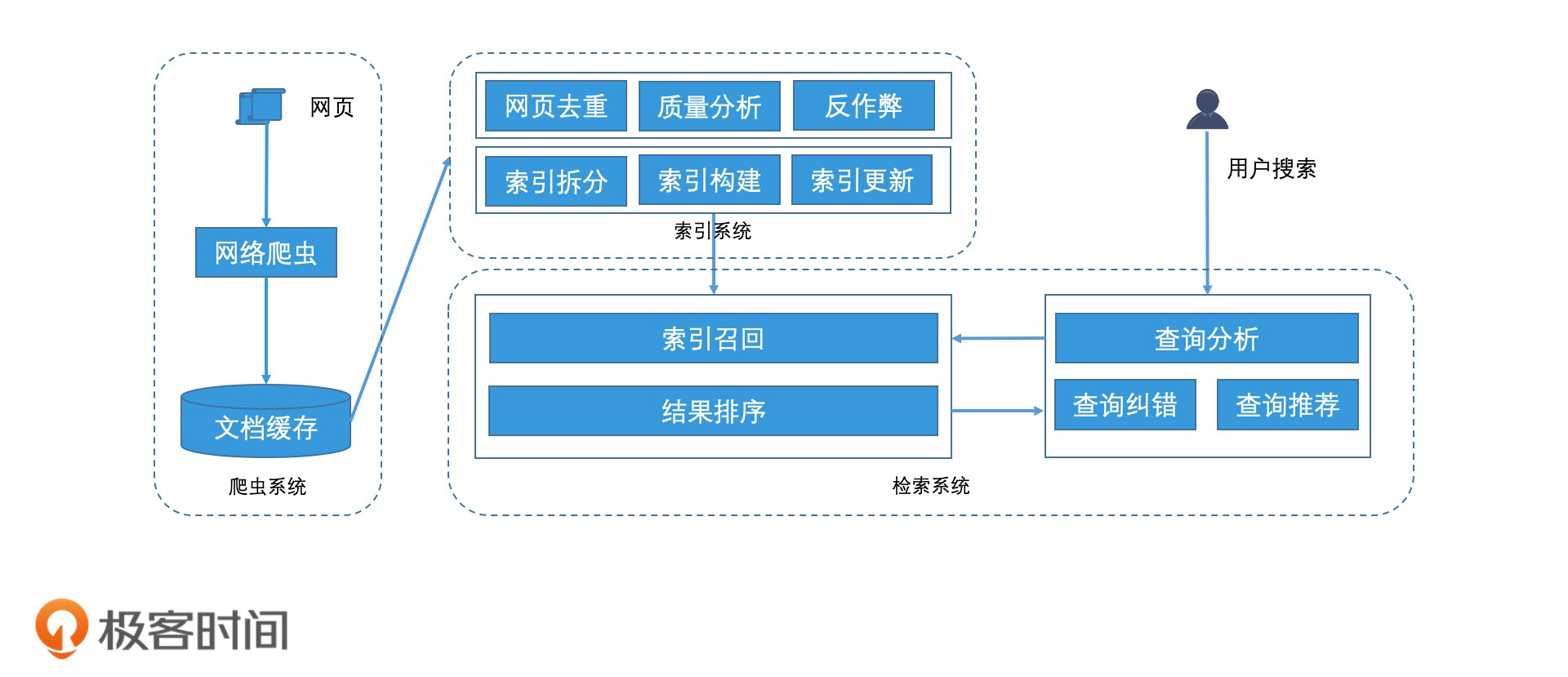 不过,我们可以从功能结构上,把搜索引擎的核心系统分为三部分,分别是爬虫系统、索引系统和检索系统。
