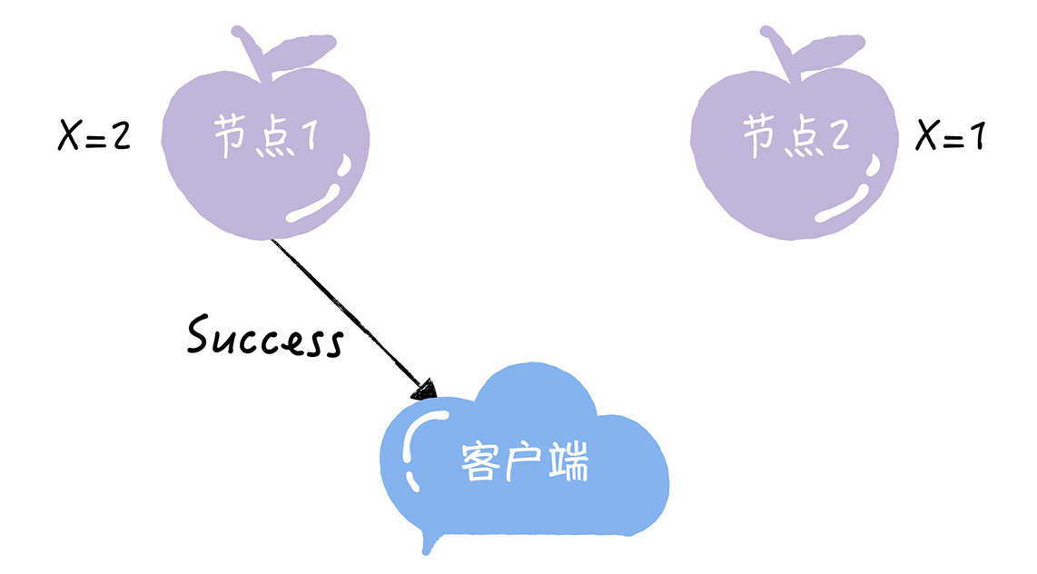 如果节点1收到写请求后,只将节点1的X值更新为2,然后返回成功给客户端。
