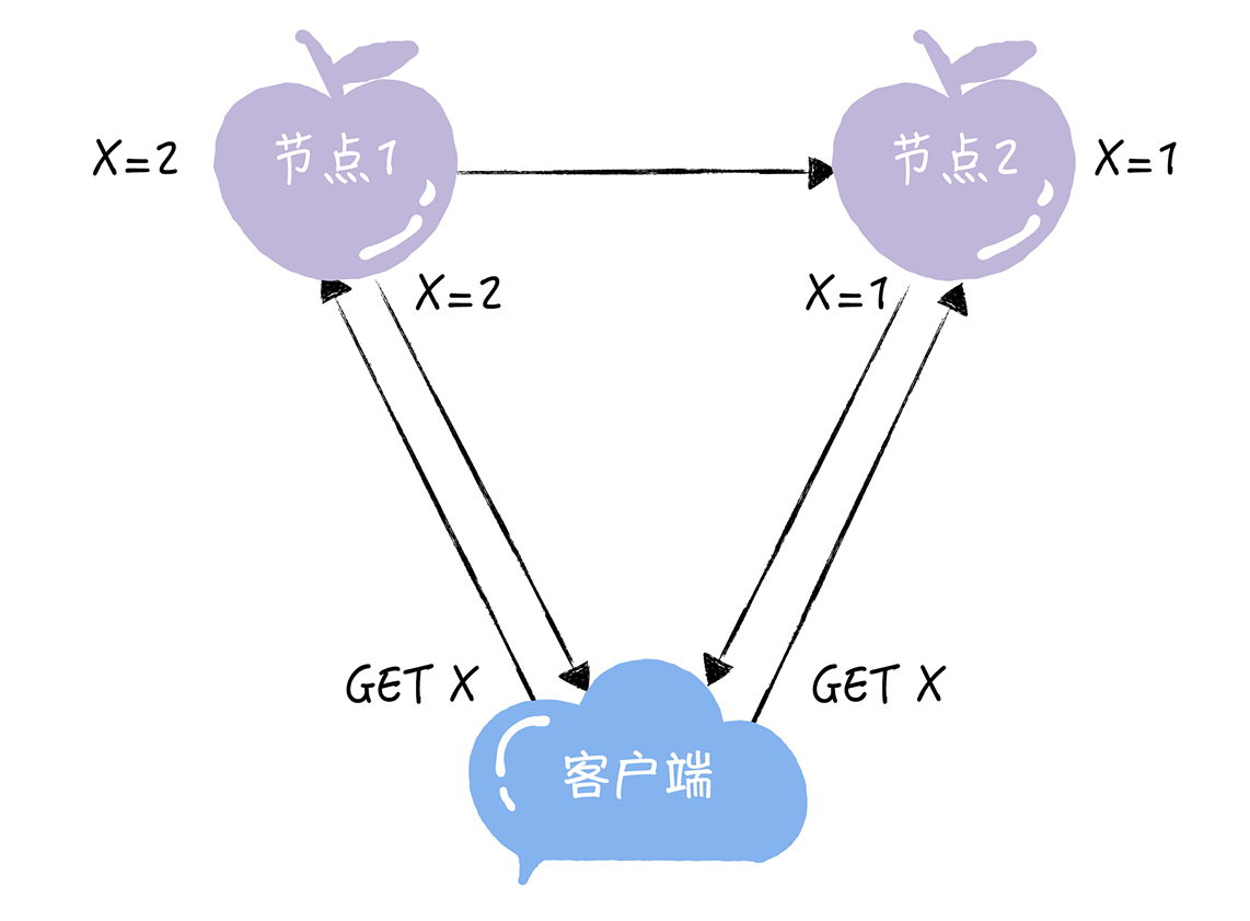 那么,此时如果客户端访问节点2执行读操作,就无法读到最新写入的X值,这就不满足一致性了。