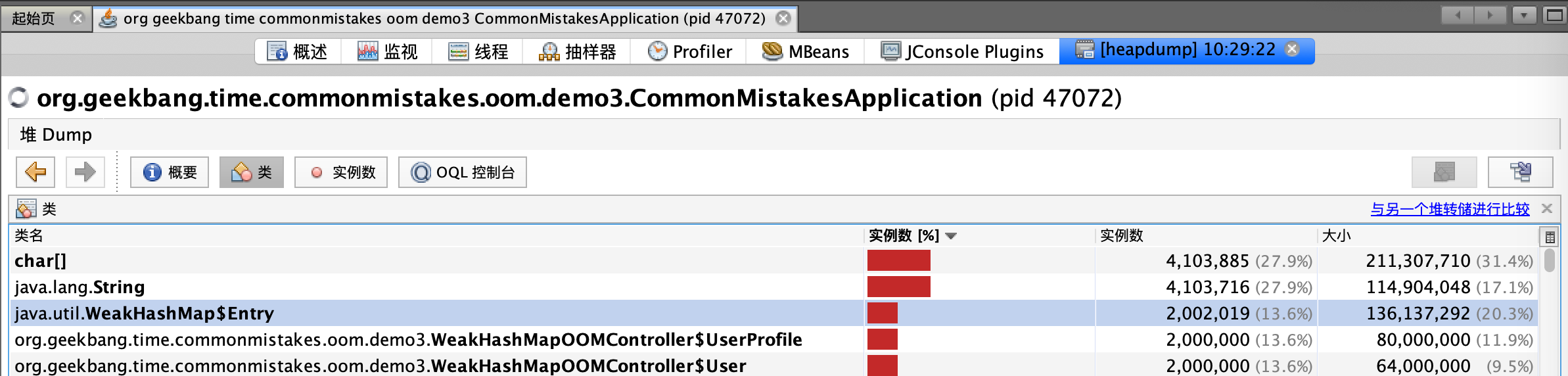 不过,我要和你分享的第二个案例,恰巧就是不久前我遇到的一个使用WeakHashMap却最终OOM的案例。我们暂且不论使用WeakHashMap作为缓存是否合适,先分析一下这个OOM问题。