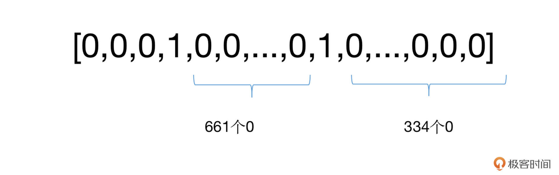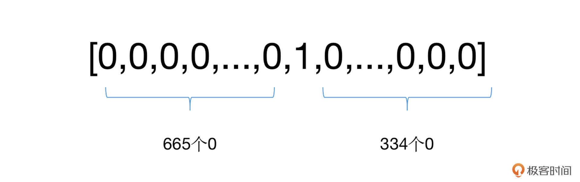 我还是举个例子来帮你加深理解。比方说,我们词典大小为10000,“极客”这个单词的序号id为666,那么我们就需要建立一个10000长度的向量,并将其中的第666位置为1,其余位为0。如下: