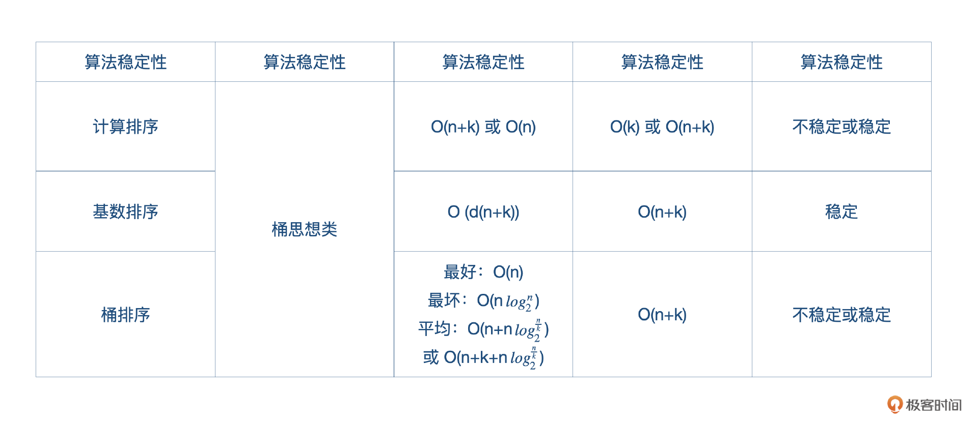 最后,我也为你整理了一下各种桶思想排序算法的时间复杂度、空间复杂度、算法稳定性表格供你参考。