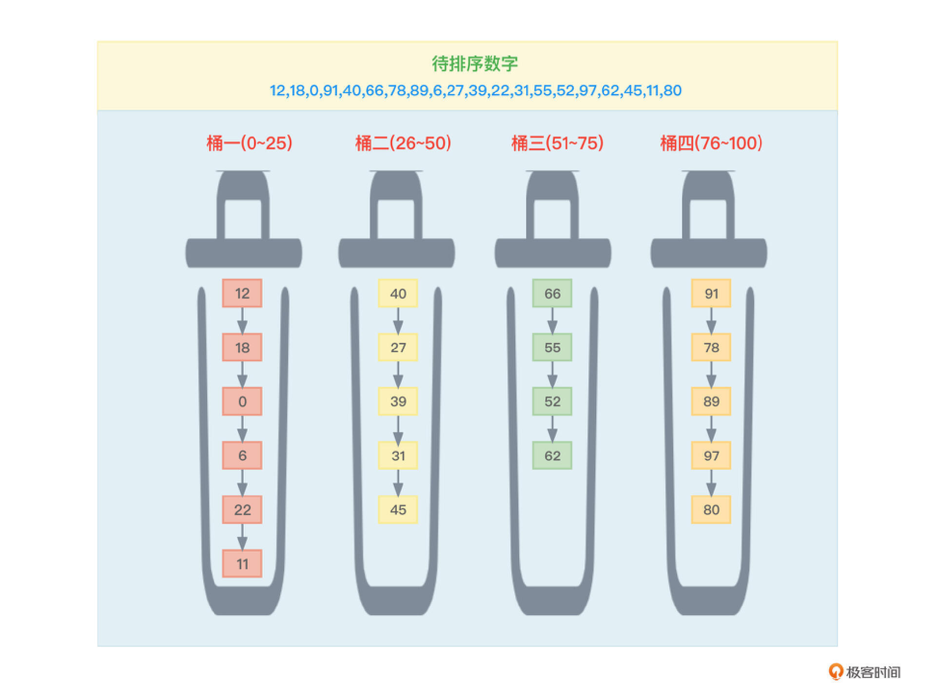 上面这组数据的范围在0100之间,所以可以把这个区间划分成4个(该数字比较随意)大小相同的子区间(4个桶):025、2650、5175、76~100。然后把这些待排序的数据根据自身大小放入对应的桶中。如图7所示。
