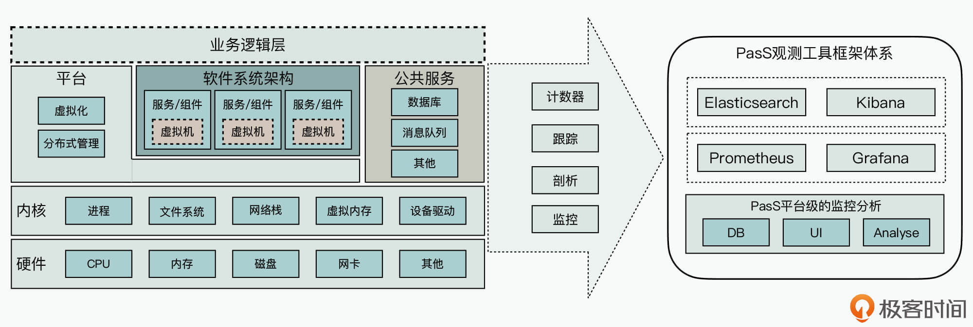 不仅如此,由于软件系统都是运行在操作系统OS和具体硬件芯片之上,所以针对一些复杂的业务性能问题,你还需要统筹好操作系统与软硬件定制开发的观测手段,一起配合,这样才能更加有效地支撑性能问题的分析定位。