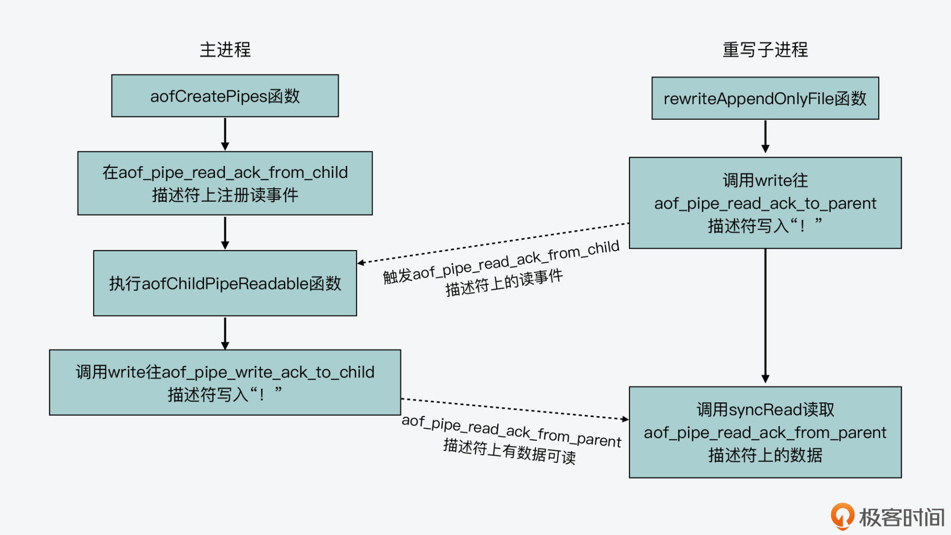 好了,现在你就了解了如何使用管道来进行父子进程的通信了。那么下面,我们就来看下在AOF重写过程中,重写子进程是如何用管道和主进程(也就是它的父进程)进行通信的。