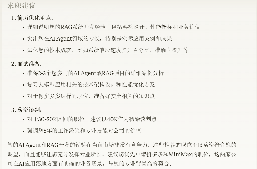 整个过程,我们就像找了一名专业的职业发展顾问一样,不仅完全代替了传统的手工找工作的方式,而且还要比手工找工作的效率更高,准确度也更高。这就是 AI 给人类带来的生活方式的转变。