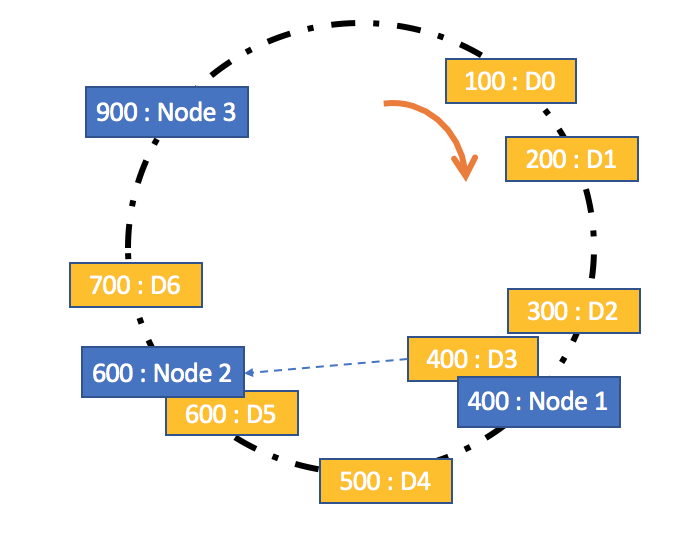 按照规则,D0,D1,D2和D3顺时针方向的下一个存储节点为Node1,因此Node1将存储数据D0(id = 100)、D1(id = 200)、D2(id = 300)和D3(id = 400);同理,Node2将存取数据D4(id = 500)和D5(id = 600),Node3将存取数据D6(id = 700)。