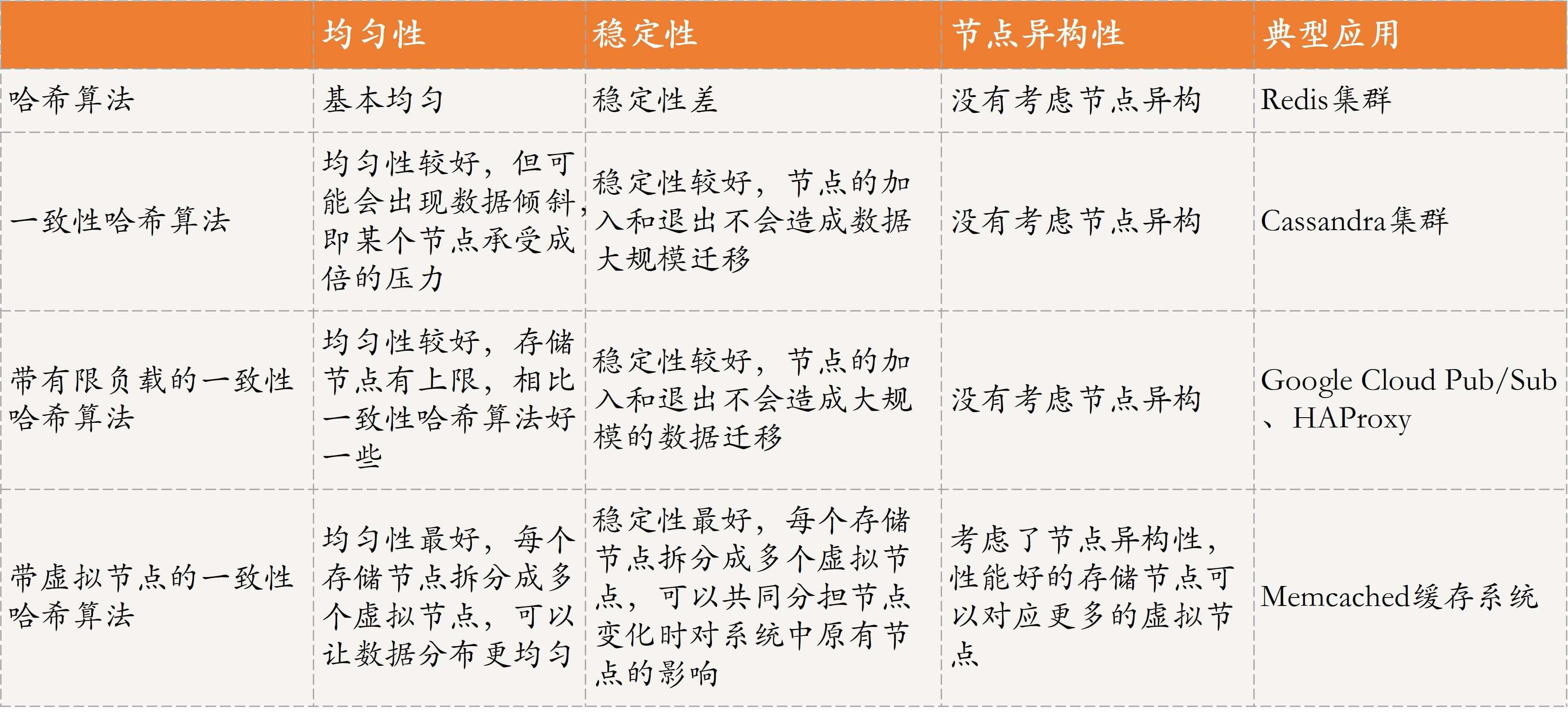 其次,基于数据分布设计原则,我为你介绍了哈希、一致性哈希、带有限负载的一致性哈希和带虚拟节点的一致性哈希方法,并以例子进行辅助讲解,以便于你理解和学习。