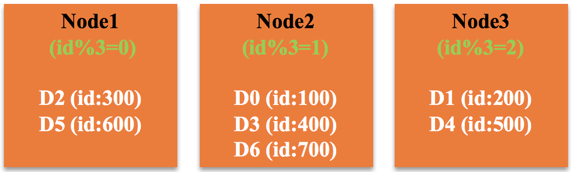 如图所示,Node1将存储数据D2(300%3=0)和D5(600%3=0),Node2将存储数据D0(100%3=1)、D3(400%3=1)和D6(700%3=1),Node3将存储数据D1(200%3=2)和D4(500%3=2)。