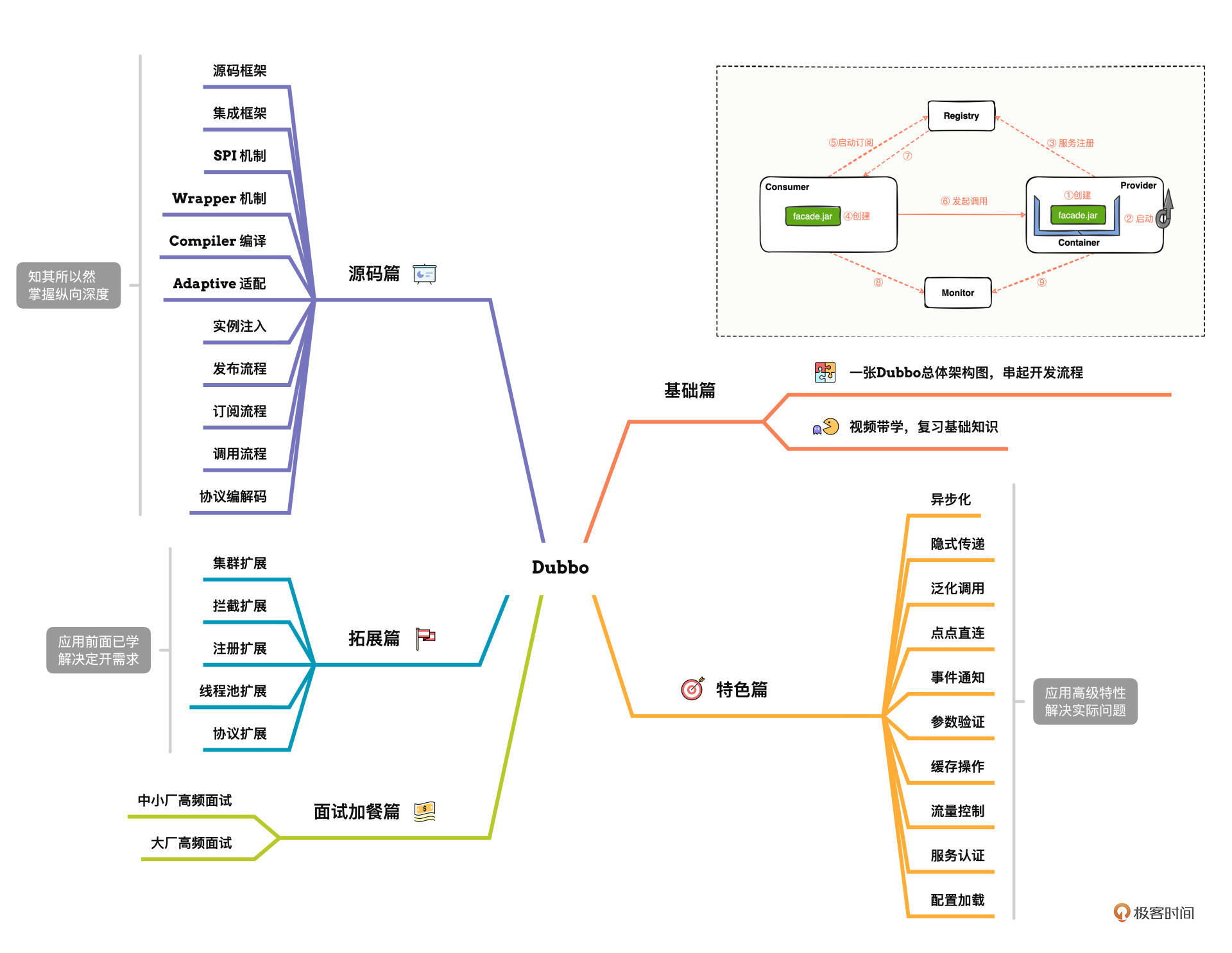 用一张Dubbo的总体架构图,把日常的开发流程串联起来,勾勒起你对Dubbo数十个基础知识点的整体印象;在此基础上,用视频形式带你统一梳理Dubbo日常开发必须掌握的基础特性,查漏补缺。