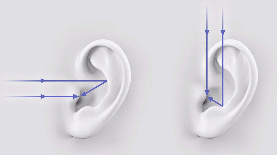 来自不同方向的声音会通过耳廓反射,或着通过绕过耳廓来进入耳道,从而让我们辨别出声音是来源于前后还是来源于上下。你可以参考一下下面这幅示意图,这就是我们通过耳廓进一步辨别声音的方位的大概原理。利用人体进一步感知声音的能力又被称为人体滤波效应。