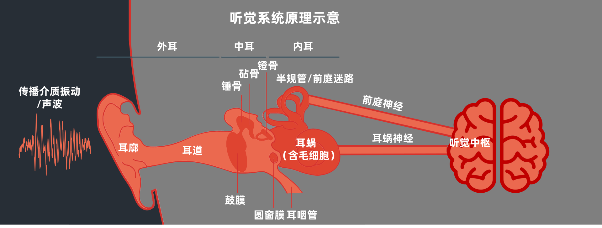 今天我们来谈谈声音设计背后的人因道理。人类大约11%的信息通过听觉系统获得。声音由声源的振动引发传播介质的振动,通过人耳传音系统到达内耳,经过听觉毛细胞把声波转换为生物电信号,再传到大脑的听觉中枢,然后我们才真正听到外界的各种声音。