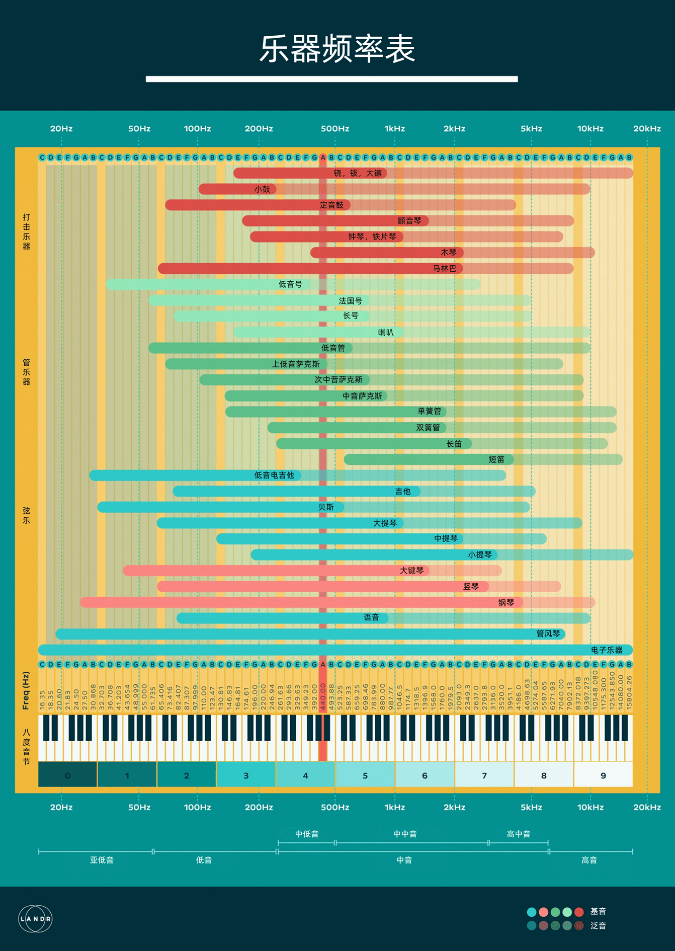下图就是乐器的频率表。每种色彩代表一种类型的乐器,深色是基音,浅色是对应的泛音。你可以重点看看基音的频率范围部分。