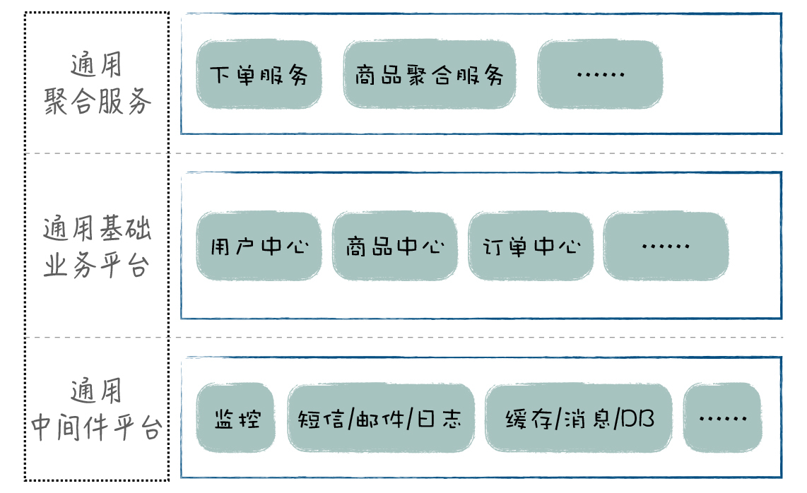 现在大家谈论比较多的是业务中台,那我们就来具体看下一个典型的业务中台的结构。它一般包含三层,从上到下分别是通用聚合服务层、通用基础业务平台和通用中间件平台。