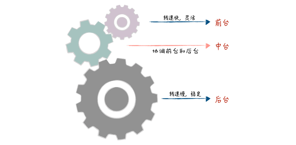 但问题是,前台和后台的特性是不一样的。前台对外,我们知道,消费者的需求快速多变,所以前台需要能快速响应,做到低成本试错;而后台对内,企业内部的业务流程不能经常变,所以后台需要稳定,不能随意调整,一旦改动,影响面广,成本很高。