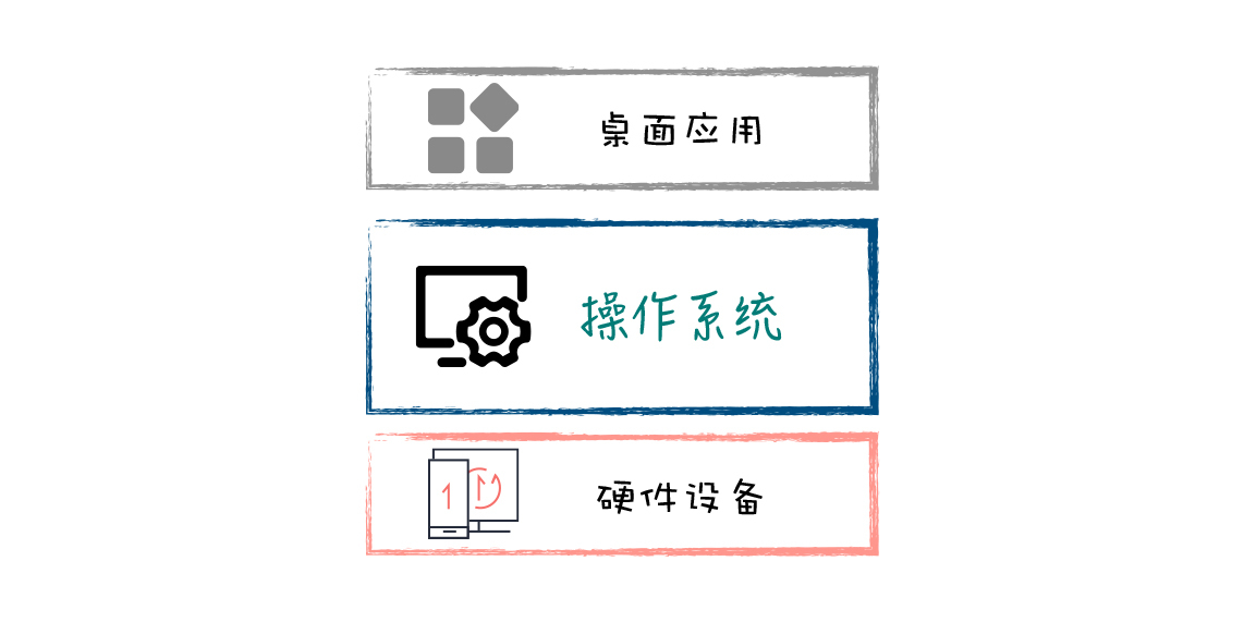 在Windows系统里,最上面是各种桌面应用,比如Office套件等,这些是用户能够直接看到的部分;最底下是各种硬件设备,比如磁盘、内存、CPU等;中间是操作系统,它处于软硬件之间。