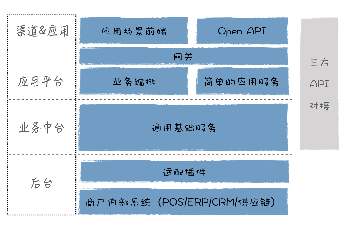 后台包括两部分,第一部分是适配插件,用于连接商户内部系统和中台基础服务,比如,在中台的商品服务和后台ERP之间同步商品数据,在中台的会员服务和后台CRM之间同步会员信息。一般针对每个内部系统,都有一个适配插件,它起到了类似硬件驱动程序的作用,这个一般是定制化的。第二部分是企业内部系统,这个是企业的IT基础设施,业务最终会在这里落地。
