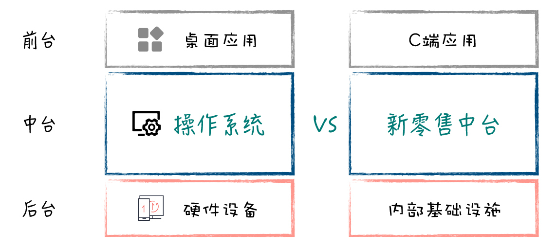 这时,如果有个中间层来负责C端应用与内部后台系统的平滑衔接,帮助新的C端应用软着陆,这样就会非常高效。这里我对比了操作系统和新零售中台,如下图所示: