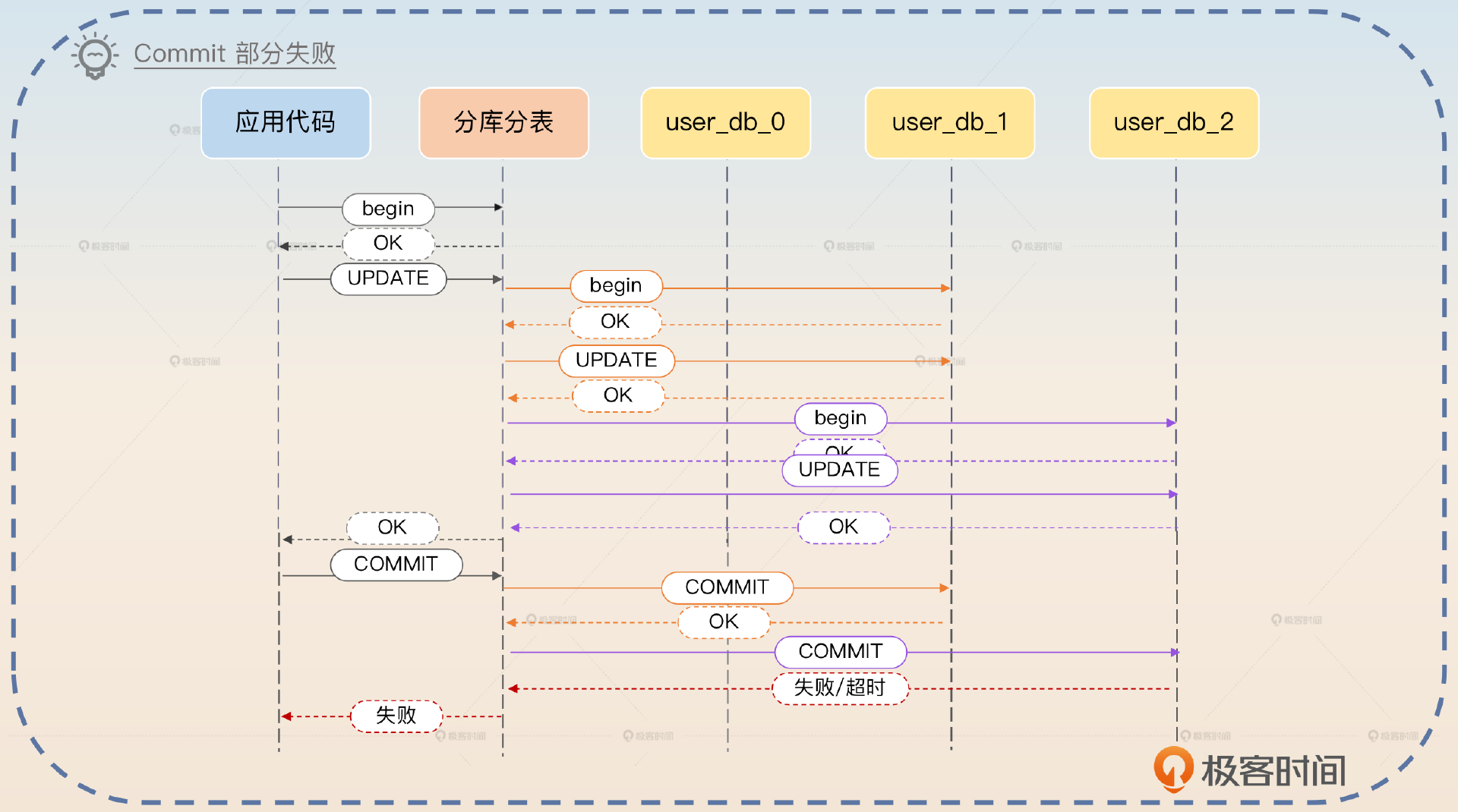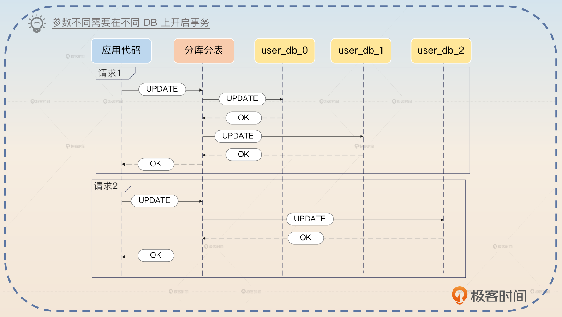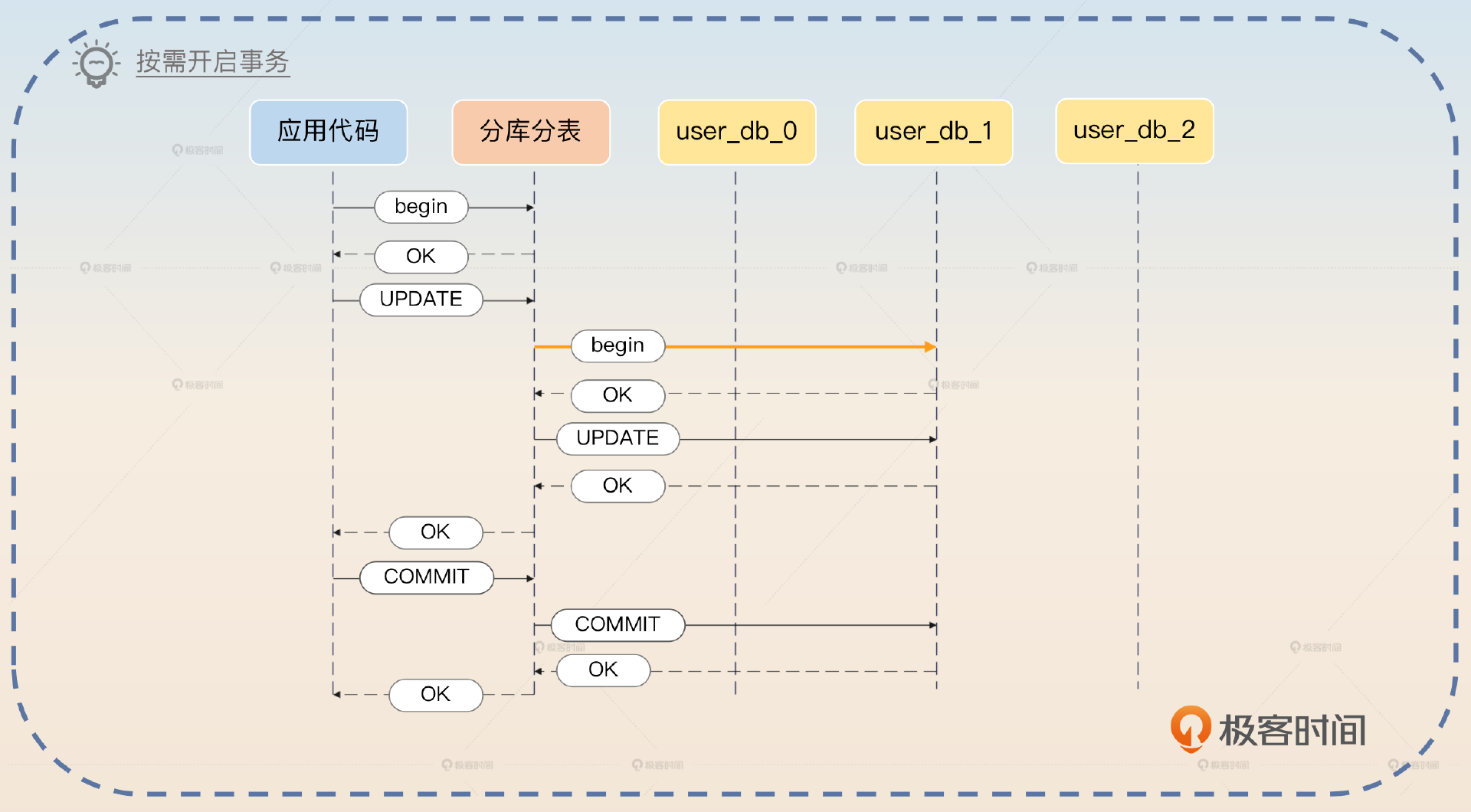 比如说,在同一个场景下,某个请求过来,你处理的时候在分库分表中间件上调用了 Begin 方法,这个请求最终在 user_db_0 和 user_db_1 上开启了事务;但是另外一个请求过来,因为参数不同,它可能最终在 user_db_2 上开启了事务。