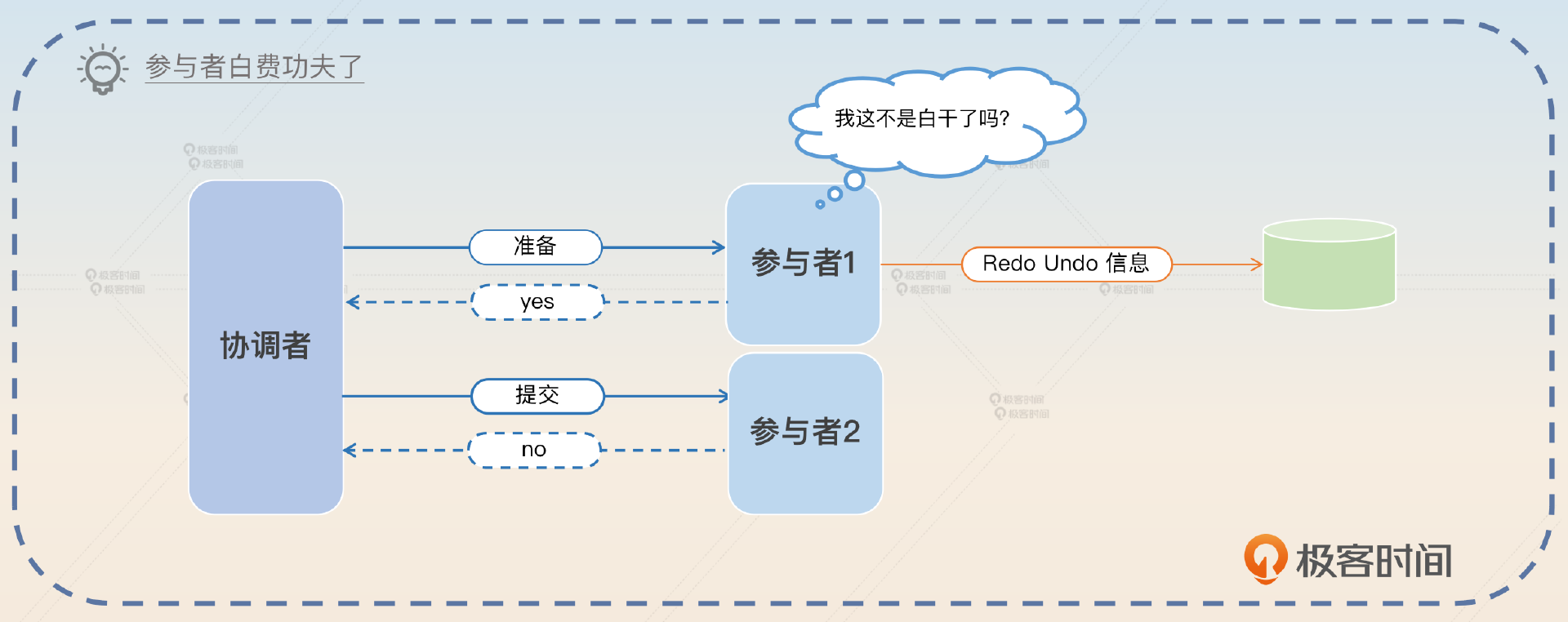 在两阶段协议里面,比较容易出现的一个情况就是参与者在准备阶段辛辛苦苦把 Redo、Undo 写好,结果另外一个参与者说自己这边执行不了事务,要回滚。那么这个参与者就白费功夫了。