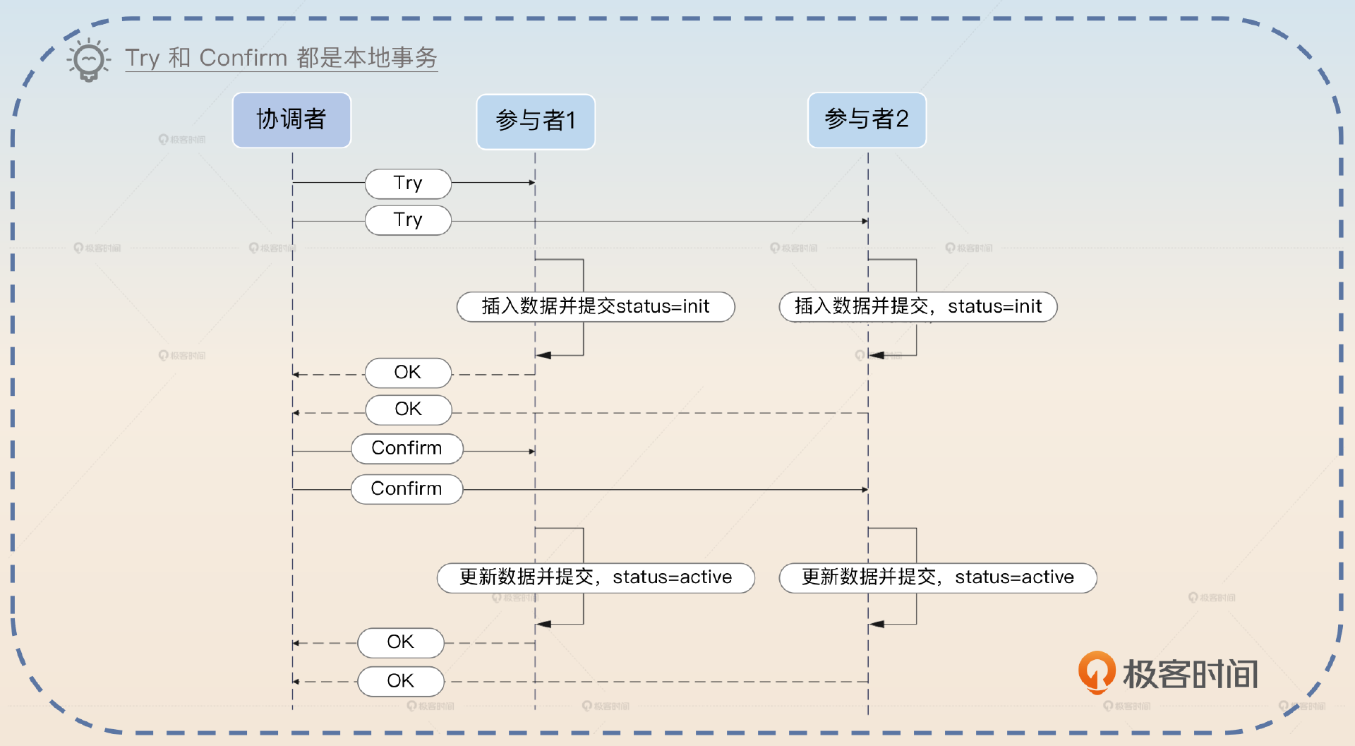 之所以给它一个新名字,完全是因为 TCC 强调的是业务自定义逻辑。也就是说 Try 是执行业务自定义逻辑,Confirm 也是执行业务自定义逻辑,Cancel 同样如此。