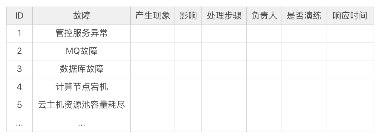 首先,第一件要做的事情就是,整个团队要想一下,线上到底能够产生哪些异常情况,越全越好。于是,我们就有了上面这个很长很长的列表。