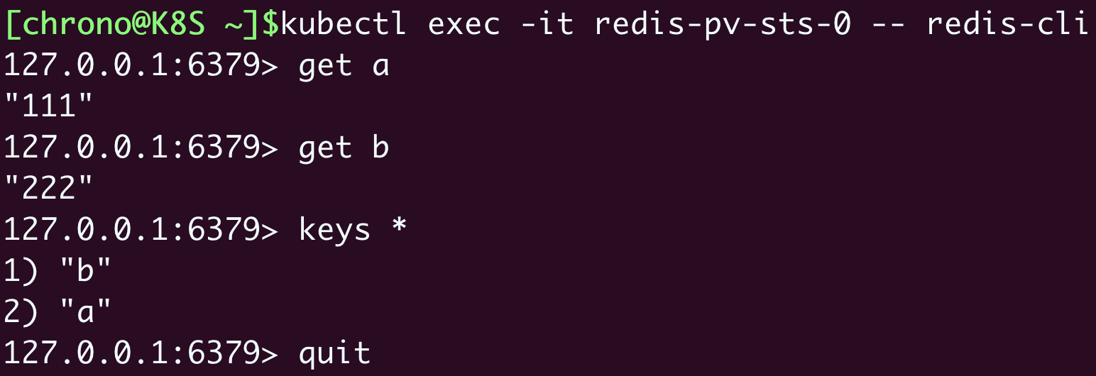 1 | kubectl exec -it redis-pv-sts-0 -- redis-cli |