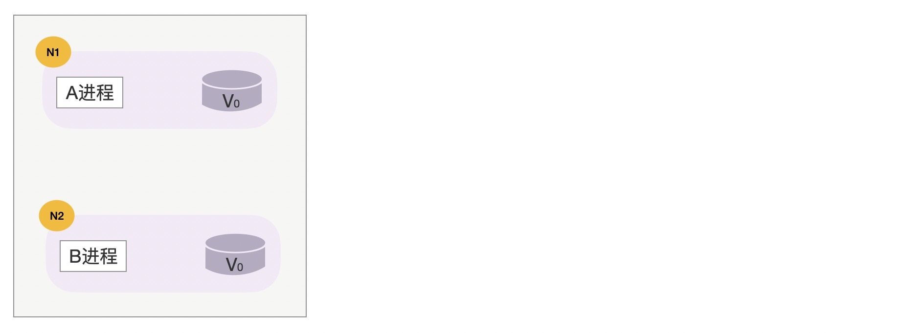 我们通过以下3张示意图,快速理解下这3个词的意义。下图中N1、N2两台主机上运行着A进程和B进程,它们操作着同一个用户的数据(数据的初始值是V0),这里N1和N2主机就处于不同的Partition分区中,如下所示: