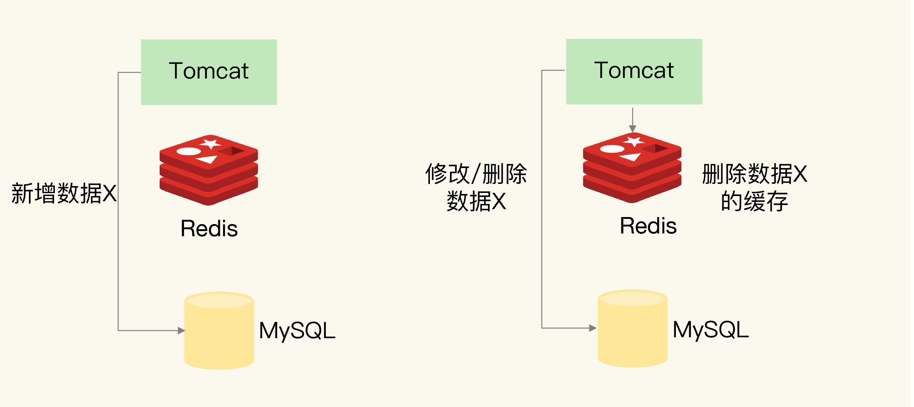 从图中可以看到,Tomcat上运行的应用,无论是新增(Insert操作)、修改(Update操作)、还是删除(Delete操作)数据X,都会直接在数据库中增改删。当然,如果应用执行的是修改或删除操作,还会删除缓存的数据X。