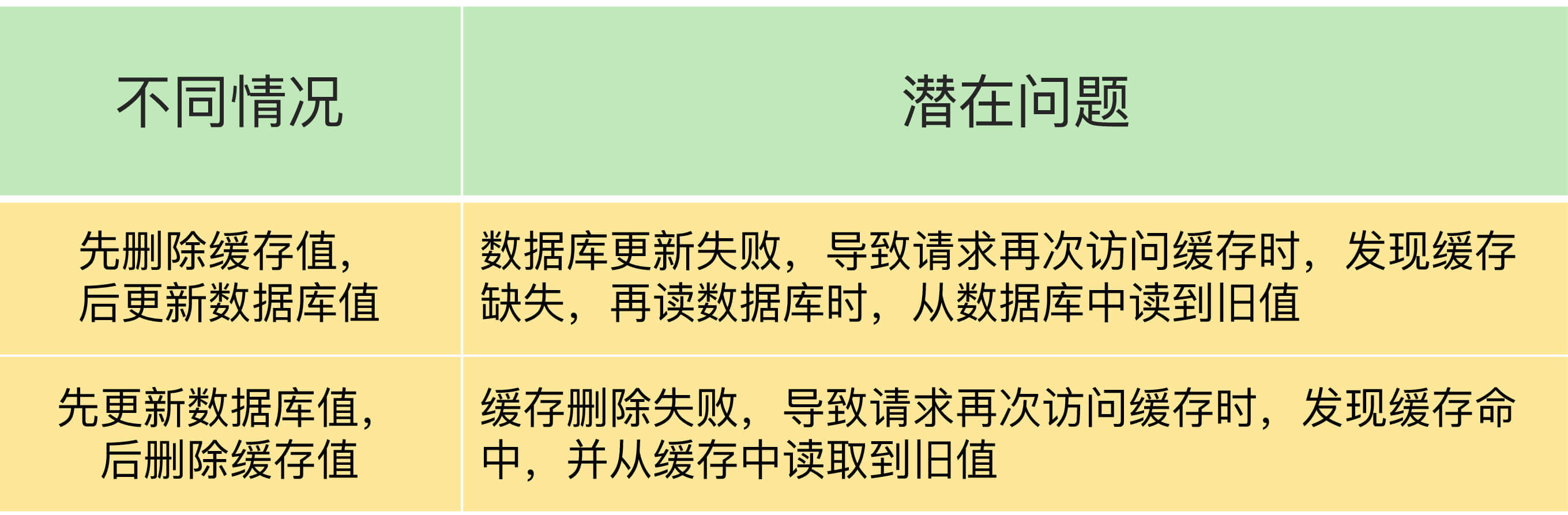 我们假设应用先删除缓存,再更新数据库,如果缓存删除成功,但是数据库更新失败,那么,应用再访问数据时,缓存中没有数据,就会发生缓存缺失。然后,应用再访问数据库,但是数据库中的值为旧值,应用就访问到旧值了。