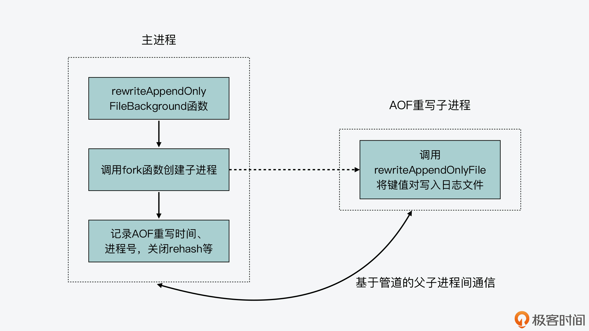 到这里,我们就大概掌握了AOF重写的基本执行过程。但是在这里,你可能还会有疑问,比如说,AOF重写的子进程和父进程,它们之间的通信过程是怎么样的呢?