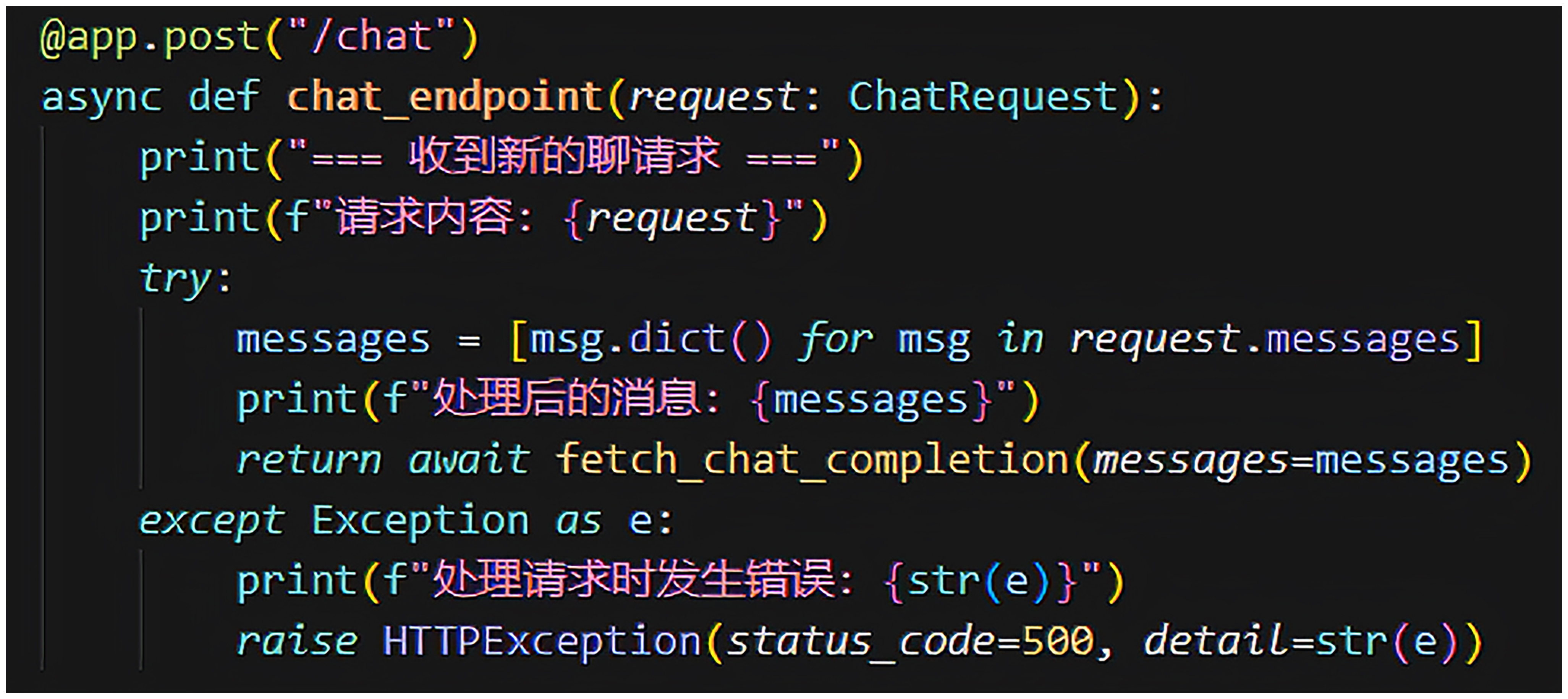 后端部分目前就一个main.py文件,没有使用任何框架。最关键的代码是定义了/chat服务,给前端使用。