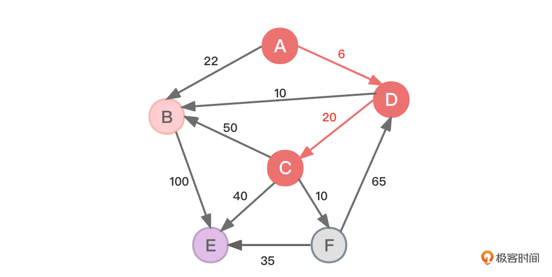 - 源顶点A到达顶点C也是通过顶点D到达的(C的上一个顶点是D)。