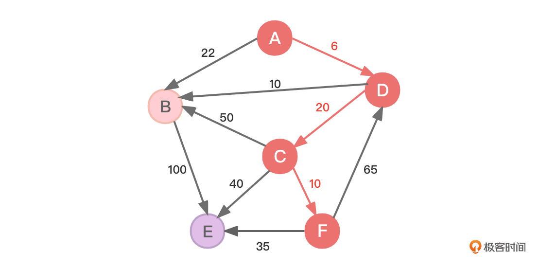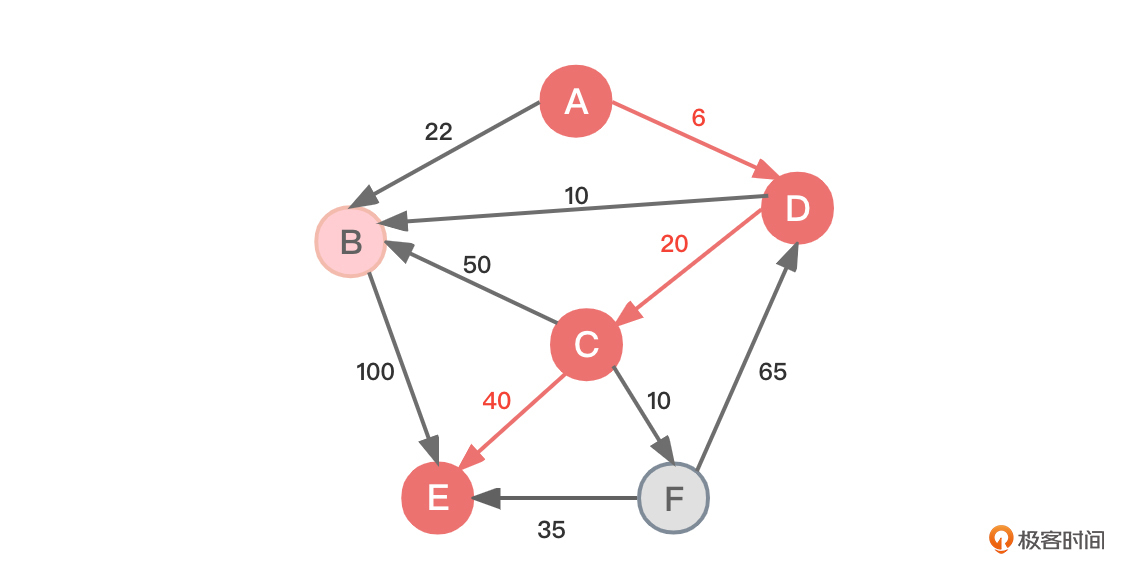 - 源顶点A到达顶点B是通过顶点D到达的(B的上一个顶点是D)。