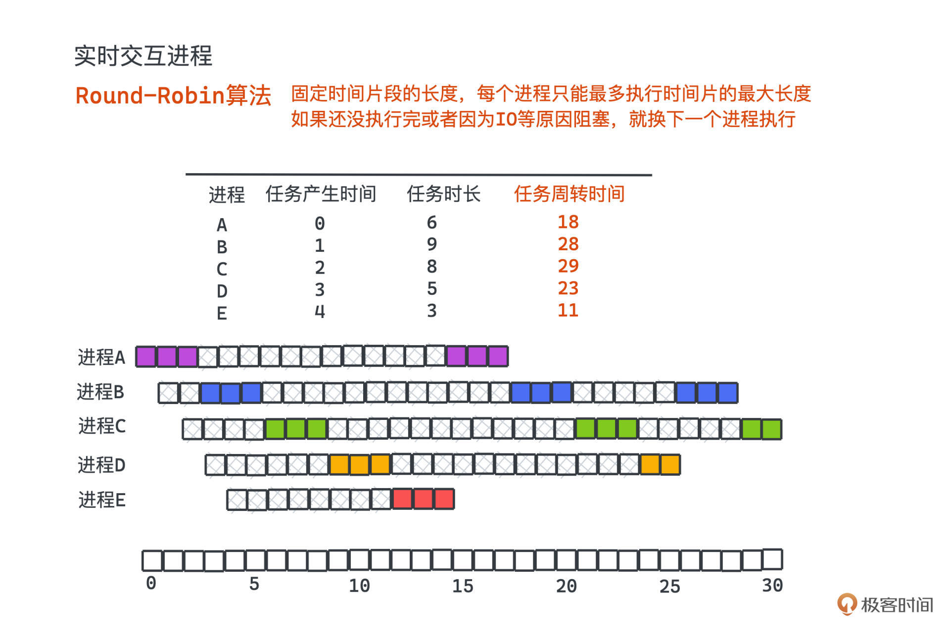 看 Round-Robin 的例子,一共有ABCDE5个进程,arrival time代表进程产生的时间,service time代表进程总共需要执行的时间,单位就是时间片的长度。