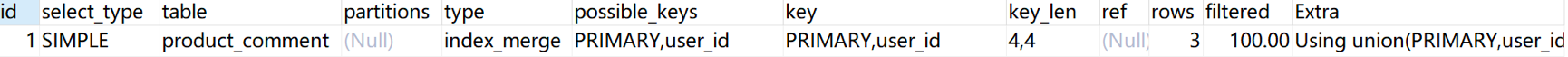 你能看到这里同时使用到了两个索引,分别是主键和user_id,采用的数据表访问类型是index_merge,通过union的方式对两个索引检索的数据进行合并。