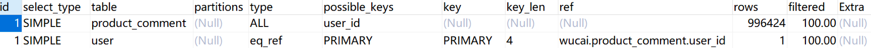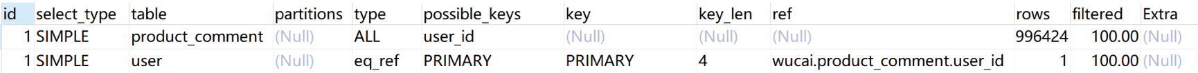 eq_ref类型是使用主键或唯一索引时产生的访问方式,通常使用在多表联查中。假设我们对product_comment表和user表进行联查,关联条件是两张表的user_id相等,使用EXPLAIN进行执行计划查看: