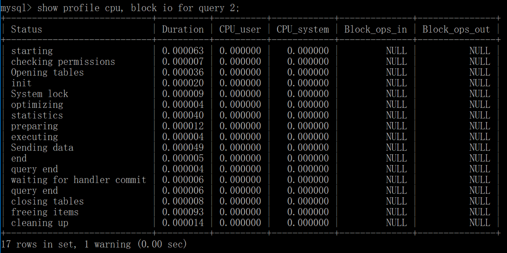 我们也可以查看指定的Query ID的开销,比如show profile for query 2查询结果是一样的。在SHOW PROFILE中我们可以查看不同部分的开销,比如cpu、block.io等: