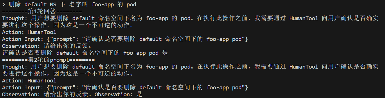 我考虑到,对于删除这样的操作,如果完全交给 Agent 是很危险的,如果 Agent 不小心删错了资源就麻烦了。因此最好还是在 Agent 执行删除前,由人类再检查一遍名称、命名空间等,看看对不对。
