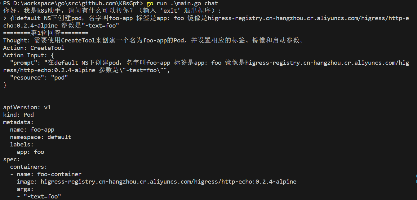 第二轮 Agent 调用了 DeleteTool,并成功删除了 pod。