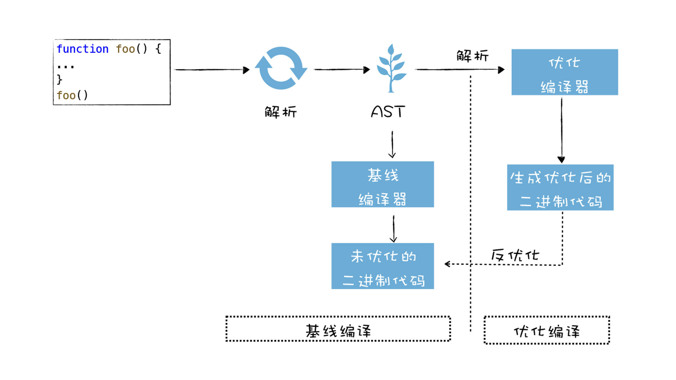 - 不过如果优化过的二进制代码并不能满足当前代码的执行,这也就意味着优化失败,V8则会执行反优化操作。