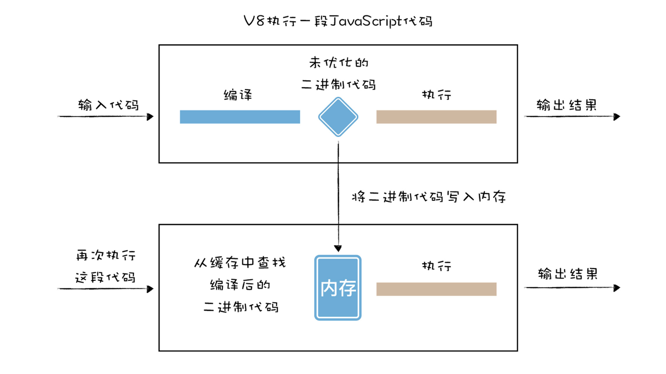 - 首先,是V8第一次执行一段代码时,会编译源JavaScript代码,并将编译后的二进制代码缓存在内存中,我们把这种方式称为内存缓存(in-memory cache)。然后通过JavaScript源文件的字符串在内存中查找对应的编译后的二进制代码。这样当再次执行到这段代码时,V8就可以直接去内存中查找是否编译过这段代码。如果内存缓存中存在这段代码所对应的二进制代码,那么就直接执行编译好的二进制代码。