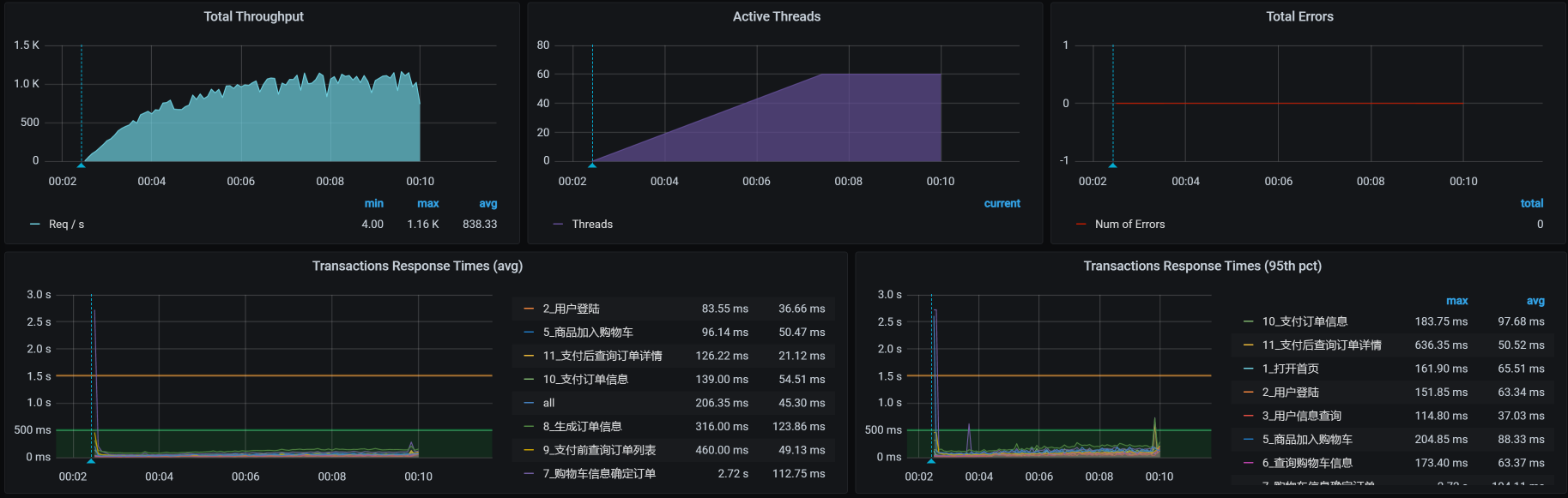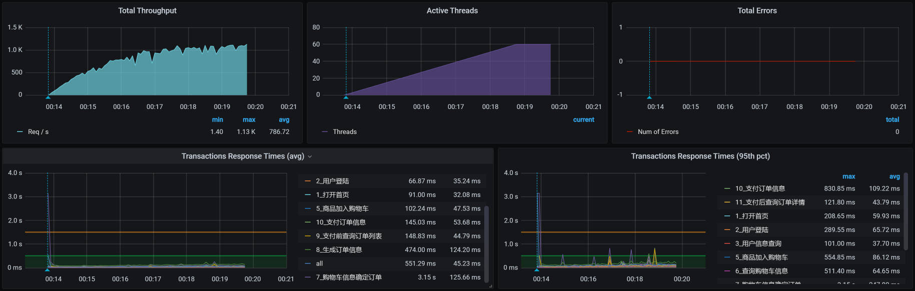 在这个场景中,你可以看到,在30压力线程时,TPS大概能达到800左右。但是,随着压力的增加,TPS也能达到1000,只是响应时间也随之有了明显的递增趋势。