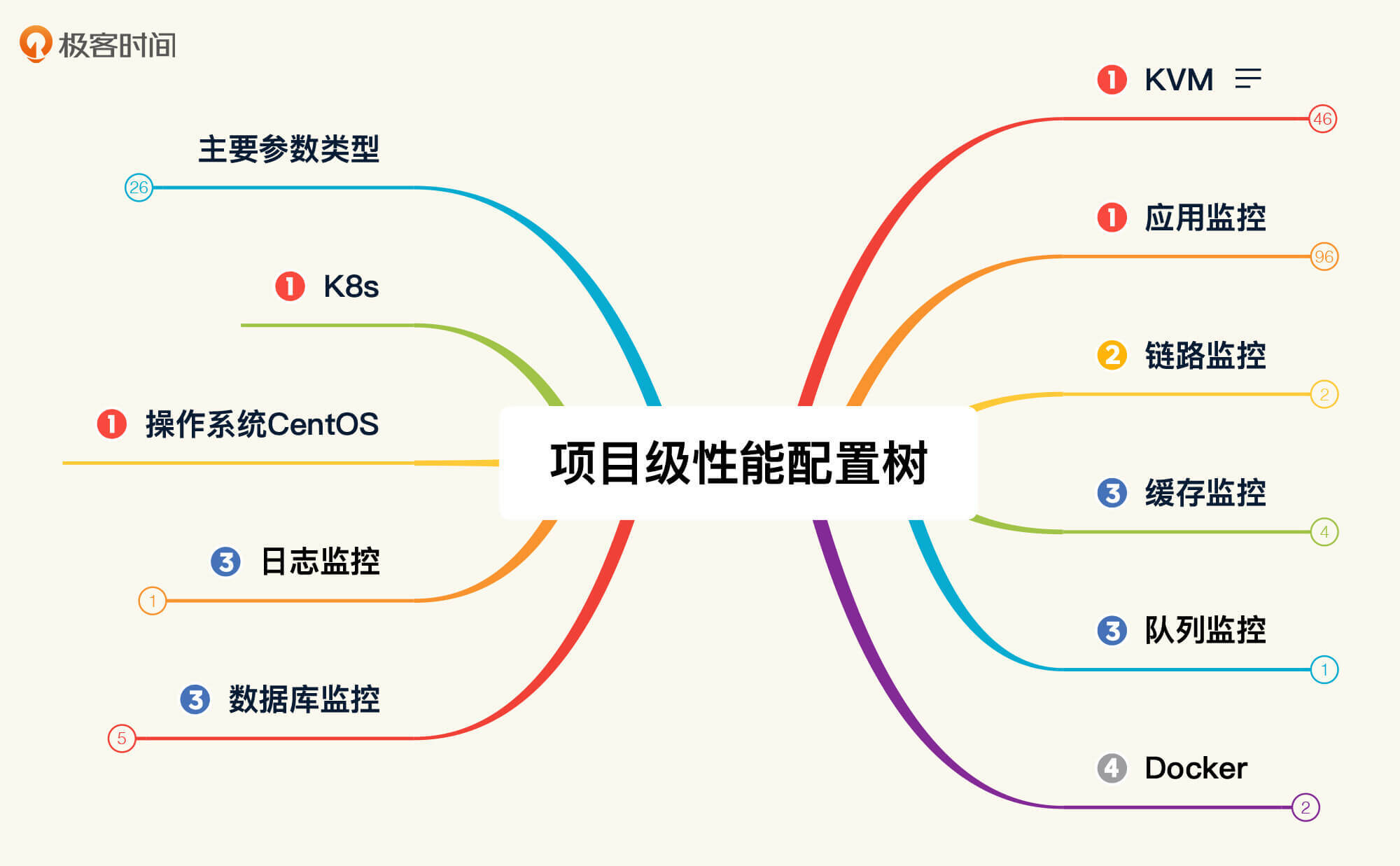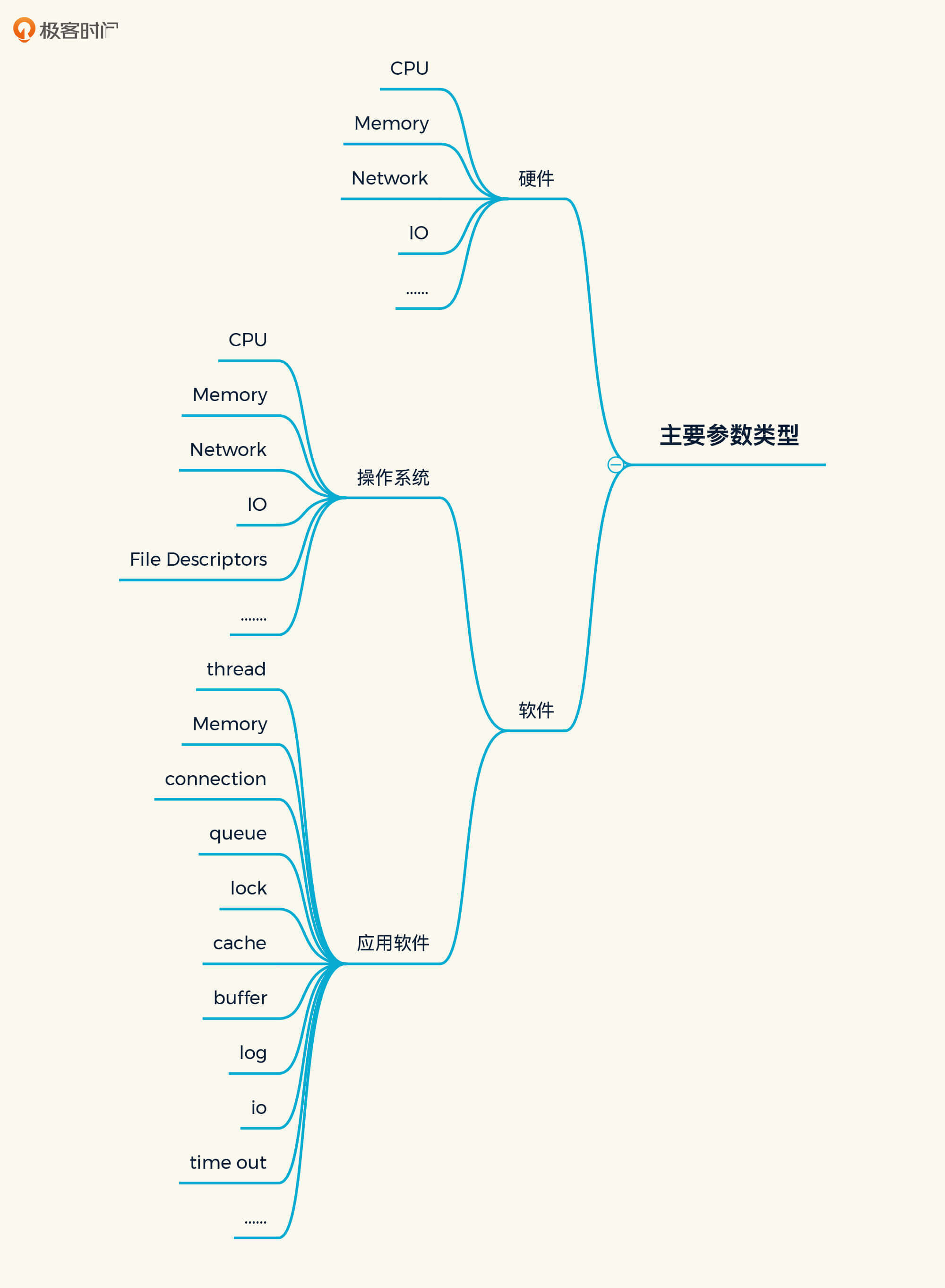 其中,硬件包含的参数和操作系统包含的参数看上去一样,不过,我们实际上要对比的内容并不一样。比如说CPU,在硬件的层面,我们要对比的是型号、主频、核数/NUMA等信息;而在软件层面,我们要对比的则是CPU使用率。其他的性能参数和计数器也有类似区别。