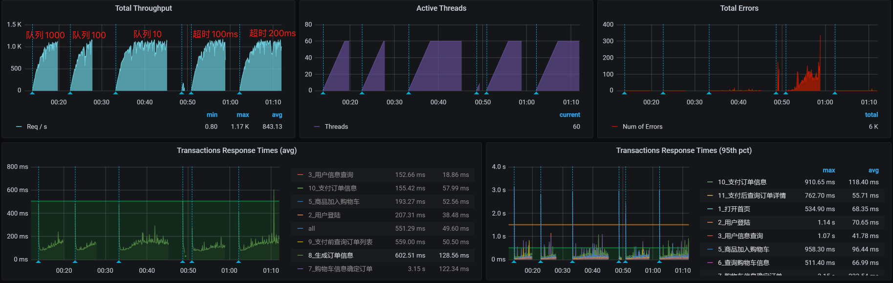 你看,报错了吧。这说明队列为10、超时为100的设置过小了,无法保持每个请求都能正常返回。现在,我们把队列设置为100,再来看一下: