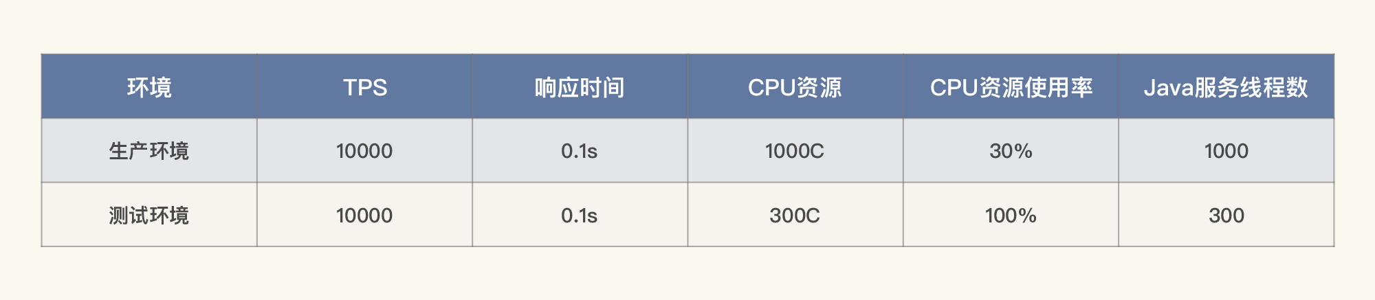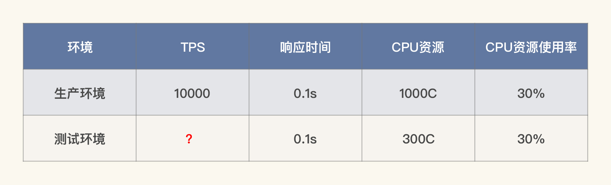 显然,这时候表格中两个问号代表的数据就不一样了。通过计算你就可以知道,测试环境要想达到1000TPS,而资源使用率也只能用到1/10(也就是30C)了。