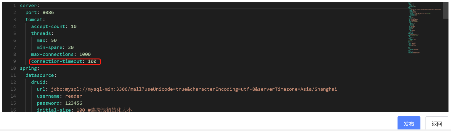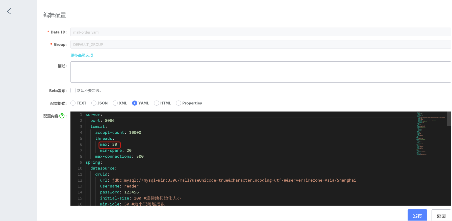 现在,我在Nacos中把max thread改为50,并发布配置: