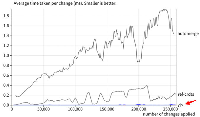 必须有!适合JavaScript生态圈的,有3个,分别是Yjs,automerge和ref-crdts。这三者的性能对比,你可以参考下面这个图(引自雪碧的文章):