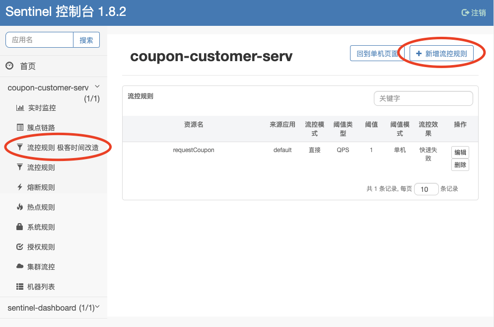 - 如果Sentinel控制台的左侧导航栏没有显示coupon-customer-serv服务,你需要通过postman对coupon-customer-serv发起一次调用,触发信息上报之后就能看到这个选项了;