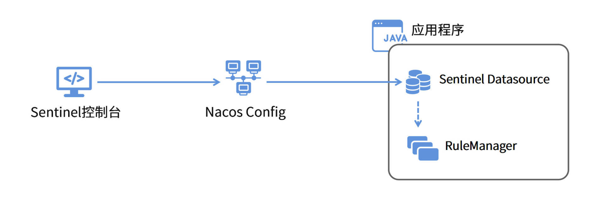 从上面的图中,你会发现,Sentinel控制台将限流规则同步到了Nacos Config服务器来实现持久化。同时,在应用程序中,我们配置了一个Sentinel Datasource,从Nacos Config服务器获取具体配置信息。